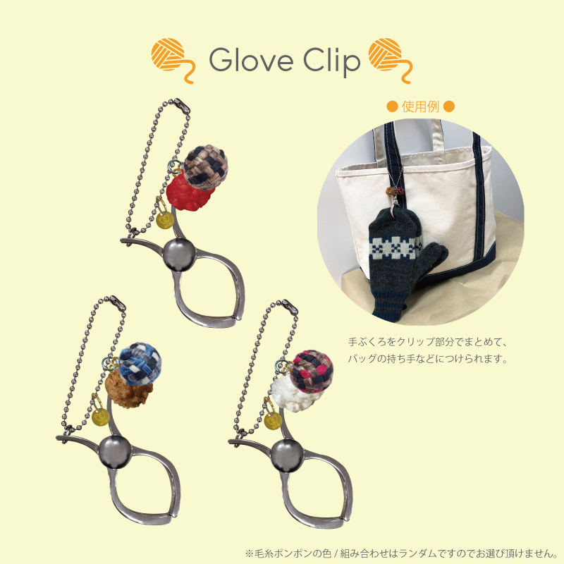 手袋を簡単にまとめられるグローブクリップ、キーホルダー、キルトピンの3種をご用意いたしました。